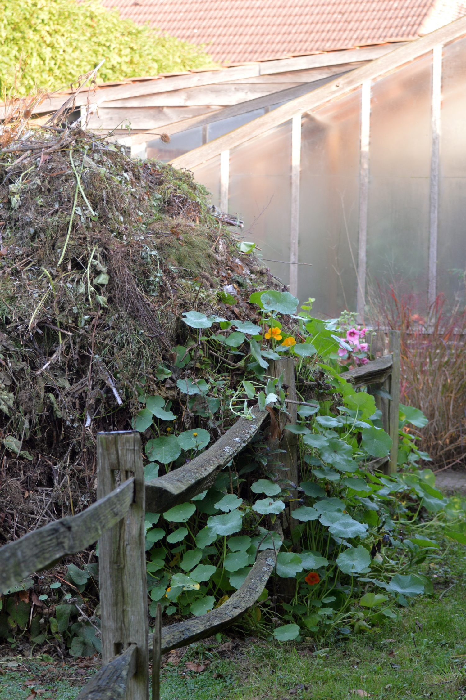 TIP. Plant een pompoen bovenop je hoop, of Oost-Indische kers. Maak een gaatje in het karton. De pompoen gaat voor klimaatregelaar spelen: hij houdt met z’n bladeren de temperatuur gelijkmatig, en onder het karton en de bladeren blijft de compost mooi vochtig. De regen kan door het karton, maar het vocht in de hoop verdampt nauwelijks. En een pompoen verstopt die minder mooie hoop.