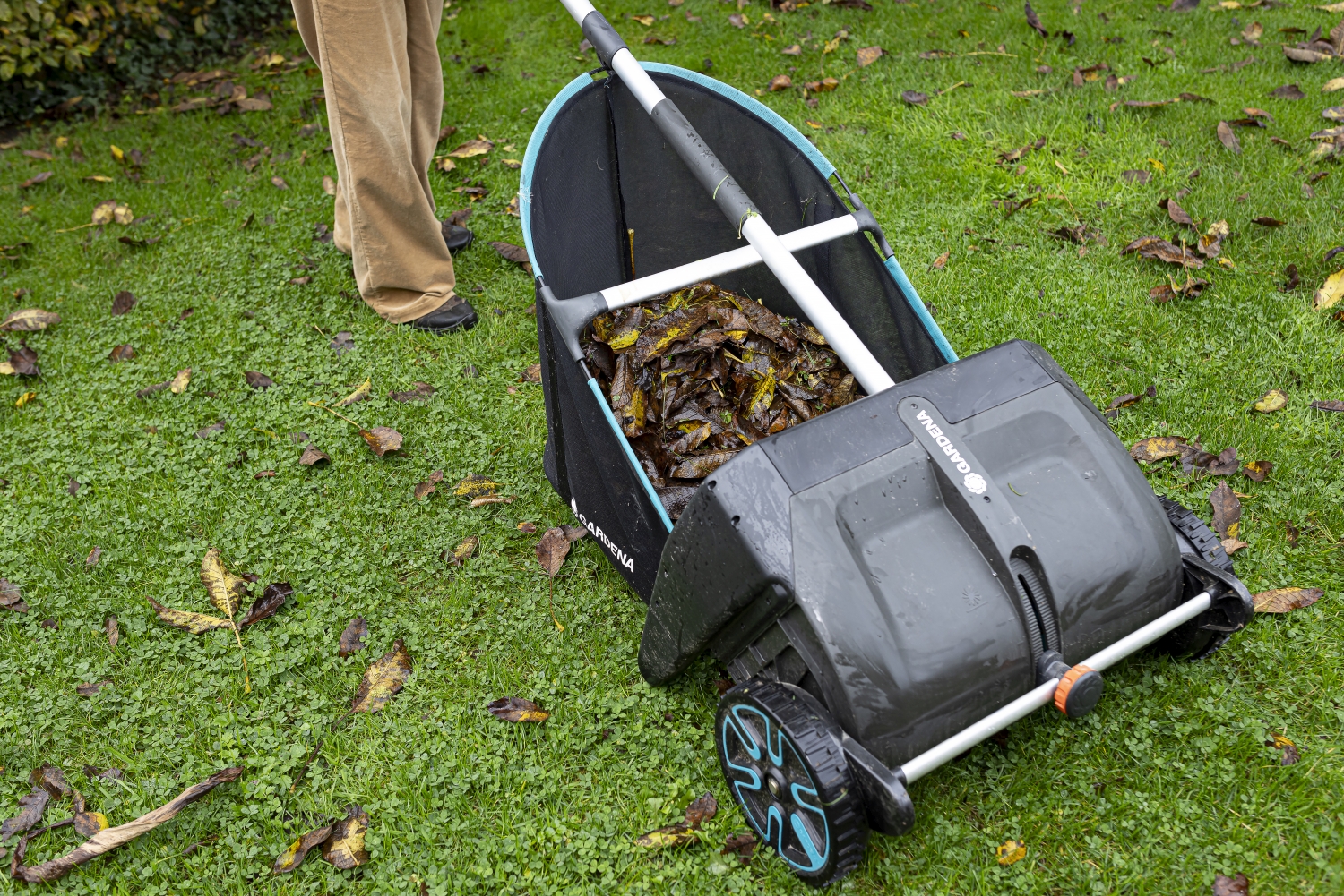 - Middelgroot gazon: het snelst bladvrij met een bladverzamelaar. Je rijdt ermee over je gazon alsof je maait, terwijl de bladeren (ook hazelnoten, beukennootjes en eikels) in de opvangbak belanden.
